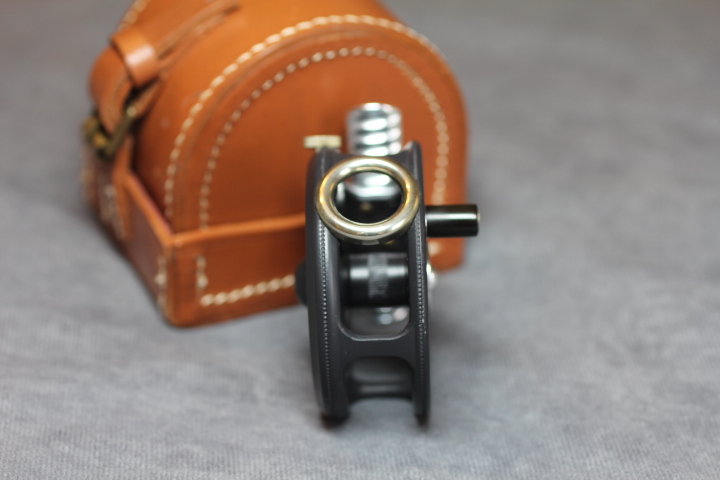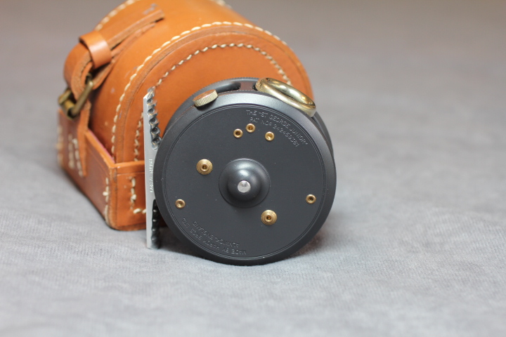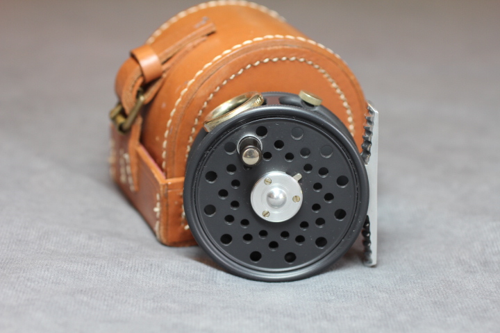Takes 2-4 wt lines. Grayish black reel finish. L.H.W. Nickel silver line guide. Quick release spool latch. Click and pawl type drag system with rim regulator button. Ribbed aluminum reel foot. Three screw latch cover. Reel comes stored in Hardy marked leather reel case. Reel is in excellent condition. $595.