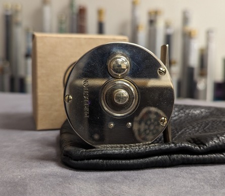 Sculptured cross bars. Ivorine handle knob. Weight 6.7 oz. Click and pawl drag