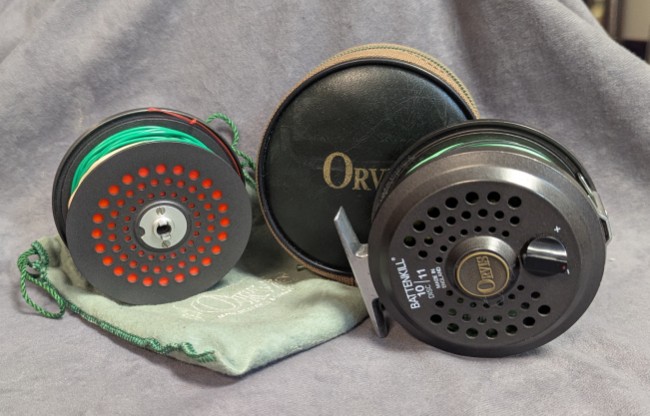 set for LHW, can be set to RHW. Reel comes stored in brown Orvis zippered reel case. Spool is stored in